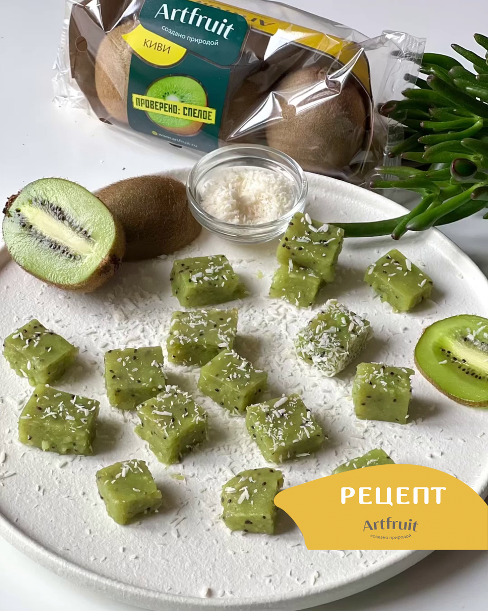 Все как мы любим! Сахара нет, потрясающий вкус спелого киви на месте. Категорически рекомендуем вместо конфет. Ингредиенты: ✔️банан спелый -2 шт ✔️киви 2-3 шт ✔️агар-агар-10 гр ✔️вода-35 гр ✔️кокосовая стружка для обсыпки Приготовление: 1. Агар-агар заливаем водой и оставляем. Тем временем очищаем и пробиваем в блендере бананы и киви до состояния однородного пюре. 2. Фруктовое пюре доводим до кипения на небольшом огне, помешивая его, после чего добавляем агар-агар и провариваем в течение 2-3 минут. 3. Разливаем массу в силиконовую формочку так, чтобы пласт мармелада получился толщиной в 1,5-2 см. 4. Оставляем массу для застывания на 3-4 часа, после чего аккуратно извлекаем, нарезаем на кубики и посыпаем кокосовой стружкой. Так как сахара, который является консервантом, в этом мармеладе нет, то хранить его лучше в холодильнике. А еще лучше сразу съесть!