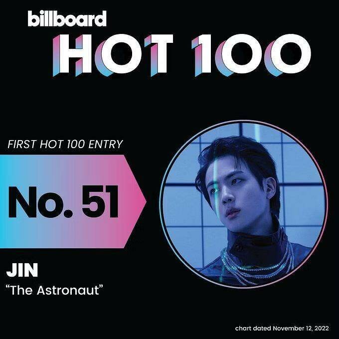 Южнокорейский певец, автор песен и участник BTS, Джин, попал в чарт Billboard Hot 100 (от 12 ноября) со своим сольным дебютом The Astronaut. По данным Luminate, песня дебютировала на 51 месте с 4,9 миллионами просмотров в США и 44 000 загрузок за первую неделю отслеживания. The Astronaut также возглавил чарт цифровых продаж песен. Айдол стал пятым участником BTS, занявшим сольную строчку в чарте Billboard Hot 100 после j-hope, Suga, V и Чонгука. Что касается BTS, на счету группы 26 позиций в чарте (с Джином в качестве участника), в том числе шесть позиций №1 среди 10 лучших. Трек BTS и Coldplay, My Universe, также возглавил хит-парад Hot 100 в 2021 году. Помимо того, что Джин попал в Billboard Hot 100 в качестве солиста, он также возглавил чарт новых исполнителей Billboard со свои сольным синглом The Astronaut, став шестым участников BTS, сделавшим это. Последняя песня Джина была встречена с огромной любовью ARMY и критиками по всему миру и продолжает получать сногсшибательные стримин