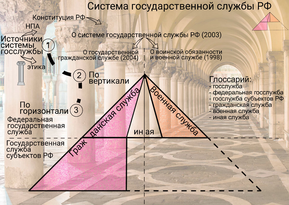 1 Источники системы государственной службы. 2 Военная, гражданская и иная государственная служба. 3 Федеральная государственная служба и госслужба субъектов РФ. Глоссарий: - государственная служба (госслужба); - федеральная государственная служба; - государственная служба субъектов Российской федерации; - гражданская служба; - военная служба; - иная служба. 1 Источники системы государственной службы. Система источников государственной службы представляет собой иерархию как правовых норм, закреплённых в нормативно-правовых актах, так и этических норм. К нормативно-правовым актам источников государственной службы относится: - Конституция РФ (Граждане Российской Федерации имеют равный доступ к государственной службе, регламентация военной службы по призыву, ограничения на поступления на государственную службу); - Закон РФ "О системе государственной службы РФ" (2003) (понятие государственной службы, принципы государственной службы, виды государственной службы); - Закон РФ "О государственн