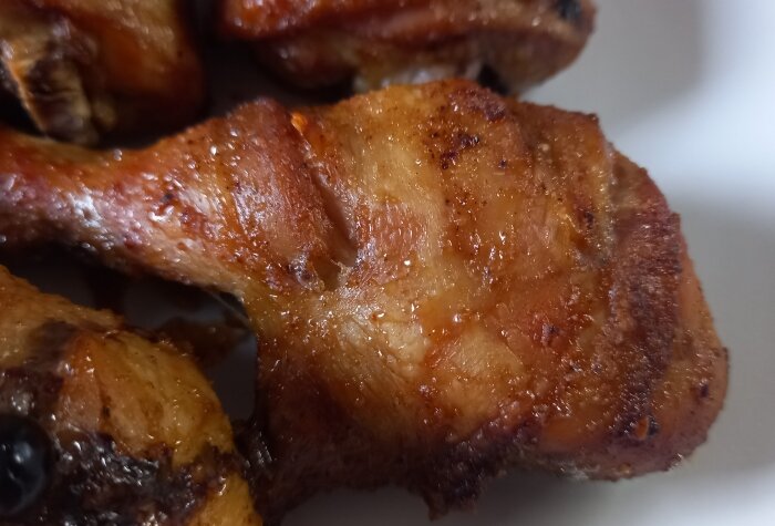 Голени и крылышки - самые вкусные части курочек, на мой вкус. И если крылышки скорее удовольствие, то голени и удовольствие и покушать. И в духовке их испечь очень просто. Главное специи подобрать. Соль, сушеный чеснок, черный перец, острый красный перец. Всего примерно по чайной ложке, острого чуть поменьше, а вообще по вкусу Добавить две ст ложки соевого соуса и 1 ст ложку растительного масла Получается очень ароматная смесь. Это будет маринад Голени сложу в контейнер, надрезы сделаю не слишком глубокие и вымазюкаю в маринаде. И не просто вымазюкаю, а еще пожамкаю, чтобы впиталось. И теперь хорошо бы оставить их в холодильнике хотя бы на часик. А можно и на ночь. А можно и сразу запекать. Но помариновать все же лучше В духовку наши ножки отправляются на противне, на 40 минут, в температуру 180 градусов Красота и вкуснота И с гарниром и без, кому как нравится