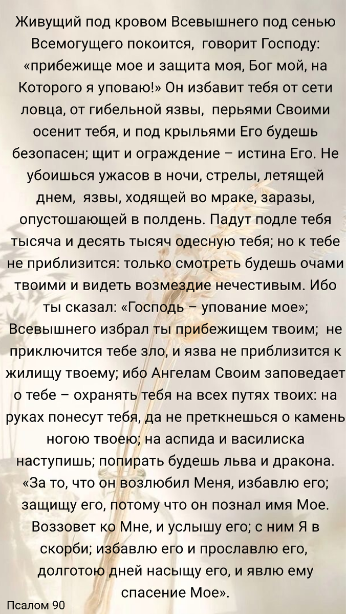 Читайте Псалом 90 в случае особой тревоги, в страхе за будущее. Когда вам необходима защита. Если вы оказались в трудной ситуации. Псалом 90 несомненно успокоит вас и даст луч надежды. 1:1. Живущий под кровом Всевышнего под сенью Всемогущего покоится, 1:2. говорит Господу: "прибежище мое и защита моя, Бог мой, на Которого я уповаю!" 1:3. Он избавит тебя от сети ловца, от гибельной язвы, 1:4. перьями Своими осенит тебя, и под крыльями Его будешь безопасен; щит и ограждение - истина Его. 1:5. Не убоишься ужасов в ночи, стрелы, летящей днем, 1:6. язвы, ходящей во мраке, заразы, опустошающей в полдень. 1:7. Падут подле тебя тысяча и десять тысяч одесную тебя; но к тебе не приблизится: 1:8. только смотреть будешь очами твоими и видеть возмездие нечестивым. 1:9. Ибо ты сказал: "Гос