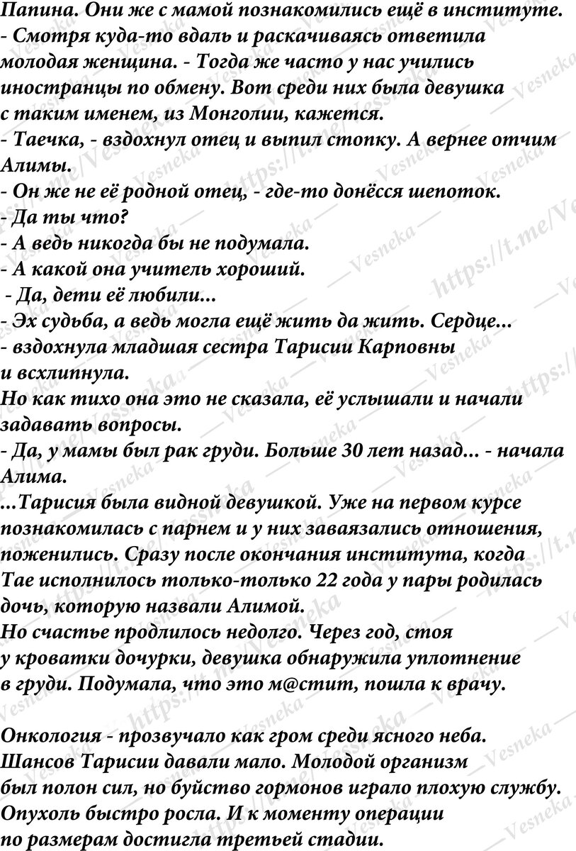 Приветный привет всем! Пришедшие на поминки родственники, друзья, коллеги, родители, ученики после пары р@мок расслабились и снятый зал в столовой наполнился разговорами. -Алима*, а чья идея была тебя так назвать? - спросил кто-то. Спасибо что дочитали. Мира Вам, добра и здоровья! Берегите себя. Химеотерапия это время для нового