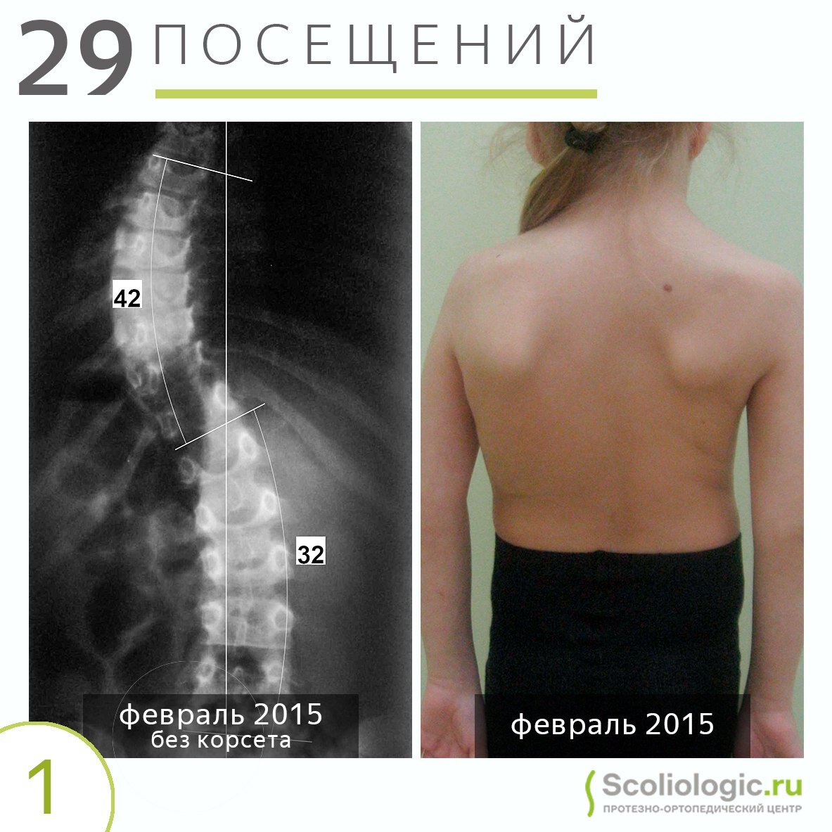 Пациентка впервые попала в Сколиолоджик.ру в феврале 2015 года, 7,5 лет, 32-42 градуса.