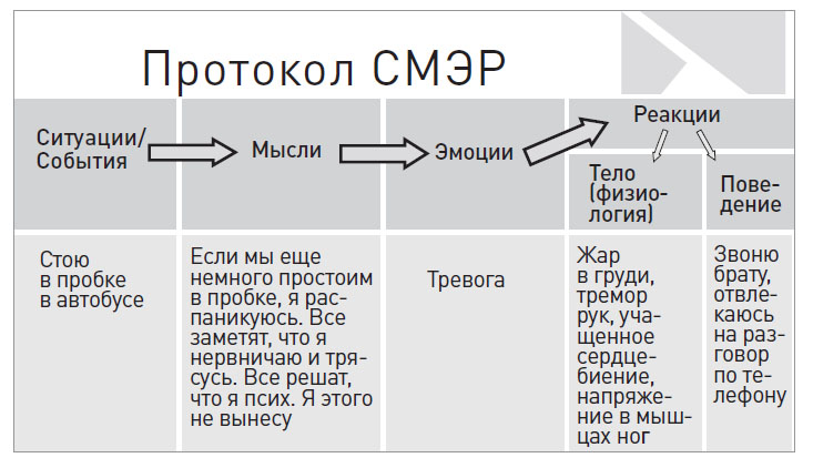 Абсолютно всем клиентам я даю это упражнение – вести дневник СМЭР (ситуация-мысли-эмоция-реакция). Выполняют они в течении всей нашей совместной работы. Это упражнение позволяет диагностировать как именно человек автоматически реагирует на происходящие с ним события.