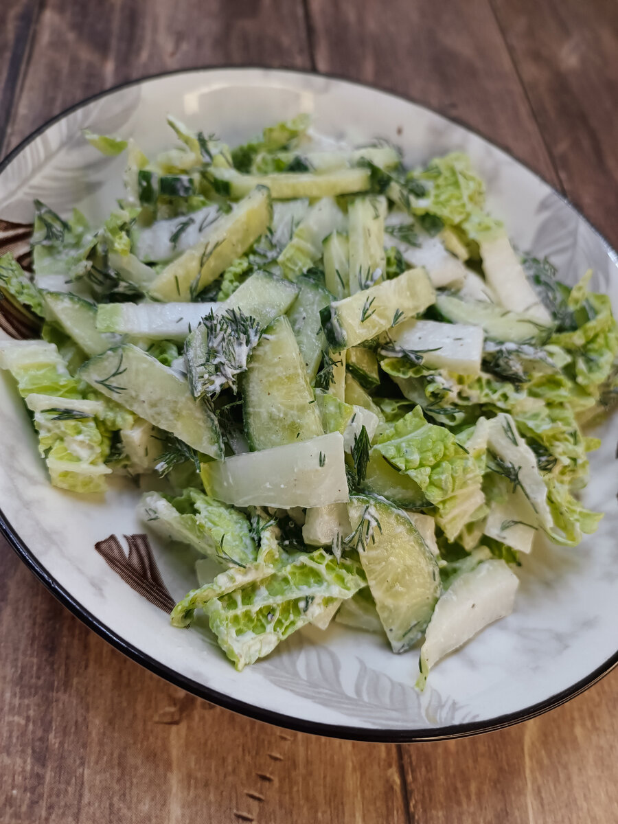 Этот салат подойдёт, как дополнение к любому вашему гарниру, можно его и с курочкой, а можно и с рыбкой, или с тем, что вам больше всего нравится. Да и времени вашего много не займёт, чтоб его приготовить. Ингридиенты: Пекинская капуста - 100 гр Огурец - 100 гр Укроп - 5 гр Рикотта - 30 гр Соль, перец по вкусу Способ приготовления: Нарезать капусту, огурец и укроп. Посолить, поперчить, и добавить к ним рикотту. Всё хорошо перемешать и салат готов. Всем приятного аппетита 😊
