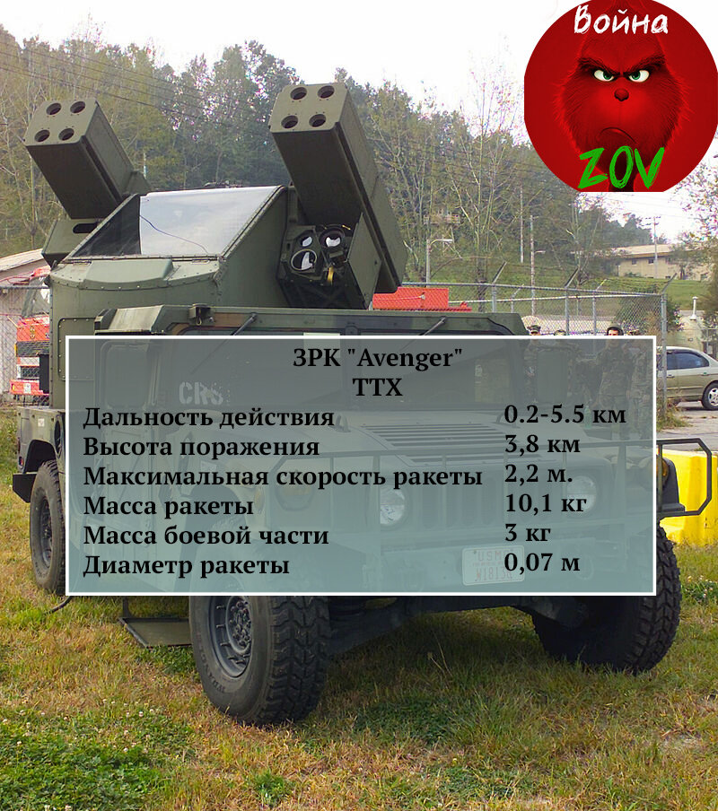 Зенитно-ракетный комплекс (ЗРК) ближнего действия "Avenger" предназначен для поражения воздушных целей на дальностях 0.5-5.5 км, высотах 0.5-3.8 км. Комплекс оснащен зенитными ракетами "Stinger". Основным компонентом комплекса является гиростабилизированная платформа PMS (Pedestal-Mounted Stinger), на которой установлены ЗУР "Stinger" в ТПК (2 пакета по 4 штуки), оптические и тепловизионные средства обнаружения и сопровождения целей, лазерный дальномер, устройство опознавания "свой-чужой" AN/PPX-3BIFF , системы управления и индикации, радиостанции AN/PRC-77 и AN/VRC-47 (в перспективе может устанавливаться система радиосвязи AN/VRC-91 SINCGARS), 12.7-мм пулемет. В качестве средства поражения в ЗРК "Avenger" используется зенитная ракета FIM-92 "Stinger" RMP (Reprogrammable Microprocessor) различных модификаций. Для самозащиты, перекрытия мертвой зоны ракет "Stinger" и стрельбы по наземным целям служит крупнокалиберный 12,7-мм пулемет M3P производства фирмы "Fabrique Nationale Herstal" (