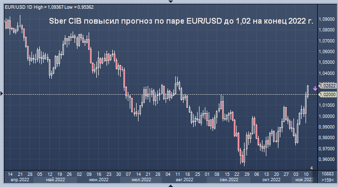Sber CIB повысил прогноз по паре EUR/USD до 1,02 на конец 2022 года График евро/доллара интервалами в 1 день Аналитики Sber CIB повысили прогноз по паре евро против доллара (EUR/USD) до $1,0200 на конец текущего года и до 1,1000 на конец 2023 года, сообщается в материале Сбербанка. Прогноз по паре доллара к рублю (USD/RUB) остается прежним, указывают эксперты: 60 руб./$1 на конец 2022 и 2023 годов. По мнению аналитиков Сбербанка, глобальное ослабление доллара будет поддерживать стабильность рубля против американской валюты, но при этом будет наблюдаться небольшое ослабление рубля к корзине других валют. MarketSnapshot - Новости ProFinance.Ru и события рынка в Telegram По теме: Курс доллара рухнул на новостях из США Не успел доллар оправиться от одного удара, как получил новый — из Китая