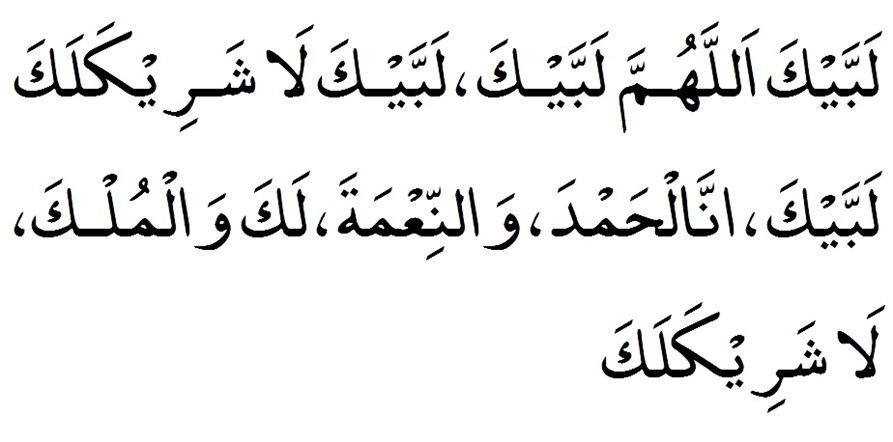 Транскрипция тальбийи: Ляббайк Аллаhумма ляббайк. Ляббайка ля шарика ляка ляббайк. Инналь-хамд уа ин-ни маh, ляка уаль-мульк, ля шарикаляк.