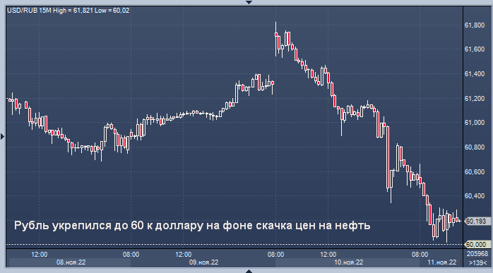 Доллар упал по всем направлениям, что поддержало нефть наряду с ослаблением карантина в Китае Курс доллар/рубля на Мосбирже интервалами в 1 минуту Курс доллар/рубля на Forex интервалами в 4 часа Рубль укрепился до пятинедельного максимума около 60 по отношению к доллару в начале торгов в пятницу, так как цены на нефть подскочили с двухнедельного минимума, а американская валюта ослабла по всем направлениям на фоне замедления данных по инфляции в США. Цены на нефть, основной экспортный продукт России, резко выросли в надежде на ослабление ограничений по борьбе с COVID в крупнейшем импортере сырой нефти Китае: к 07.30 по Гринвичу Brent подорожала на 2,47% до 95,98 доллара за баррель. Российская валюта также выиграет от нового налогового периода, начинающегося на следующей неделе, когда экспортеры будут конвертировать часть своей валютной выручки в рубли. В последний раз рубль вырос на 0,59% по отношению к доллару до 60,18. По отношению к евро рубль торговался без изменений на уровне 61,35