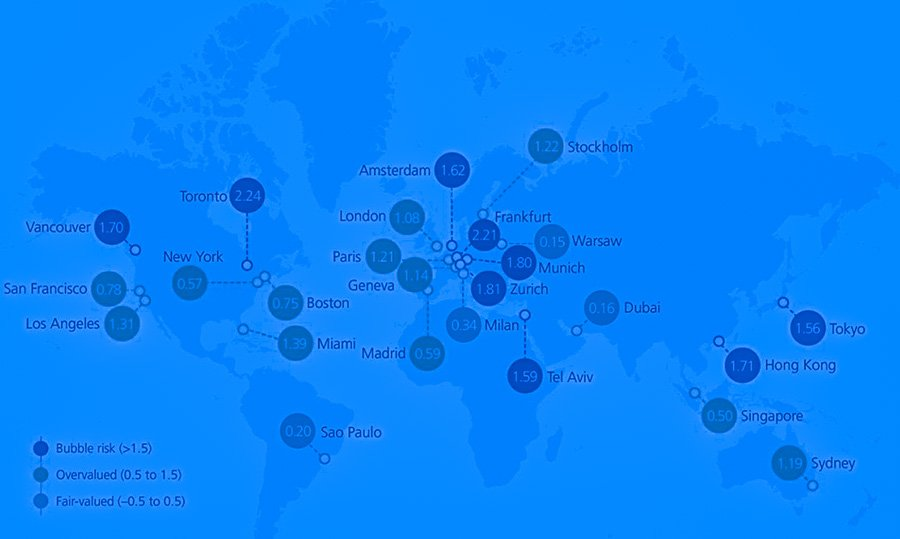 Швейцарский банк UBS опубликовал исследование, посвященное рискам на рынке недвижимости в 2022 году и в долгосрочной перспективе. При изучении 25 городов оценивались цены на покупку и аренду в соотношении с зарплатами, ставки по ипотечным кредитам и ВВП стран. Аналитики выделили несколько территорий, где наблюдается чрезмерный рост цен, похожий на формирование «пузыря», когда актив оценивается неправильно.
