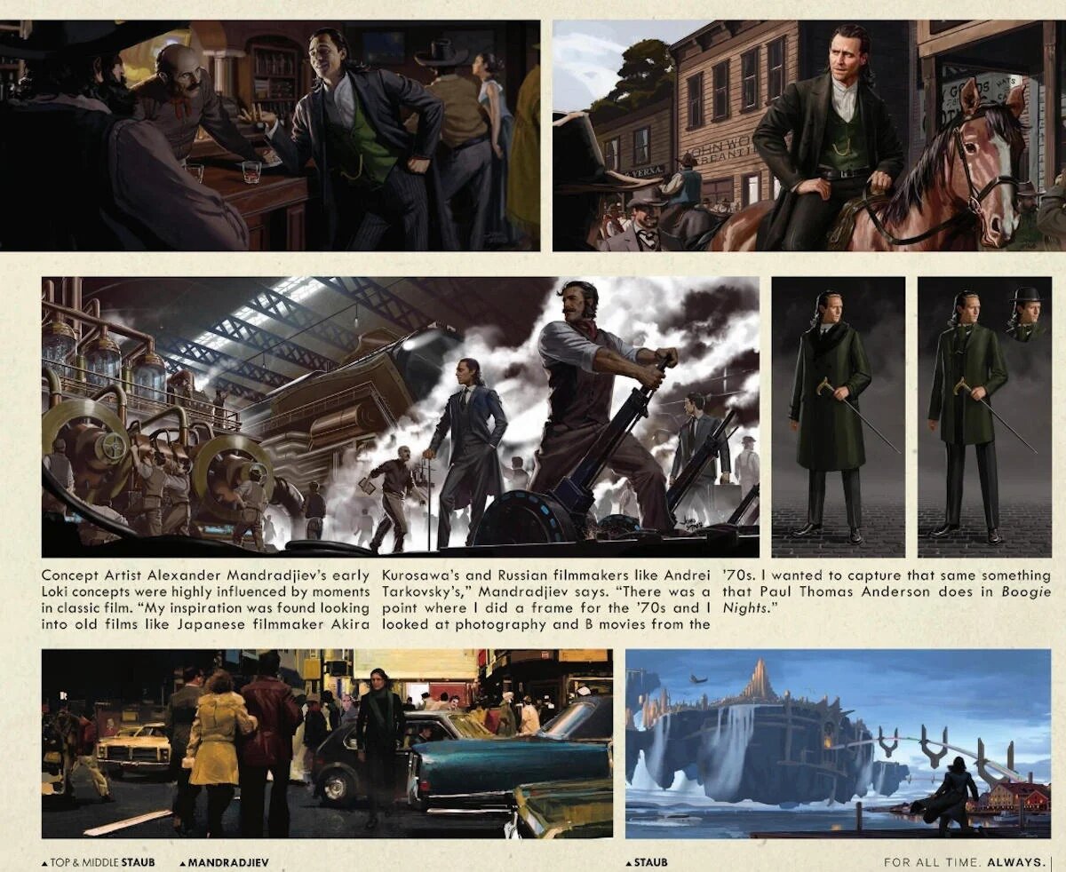 Первый сезон «Локи» (Loki) открыл дверь во всю кинематографическую мультивселенную Marvel, представив TVA (Управление временными изменениями) и концепцию альтернативных вселенных и таймлайнов. В большинстве шести эпизодов главный герой следовал вместе с TVA (и собственным женским вариантом, Сильвией) в дикие новые реальности или места во времени. Нам довелось увидеть исторические события, такие как разрушение Помпеи (79 г. н.э.), антиутопическое будущее, такое как Алабама 2050 года, инопланетные миры (Ламентис-1) и даже царство между реальностями, которое TVA использует в качестве временной свалки (Пустота). Но видимо похоже, что все те альтернативные реальности, которые были показаны в «Локи», были лишь небольшой частью того, что было запланировано изначально! В одной из новых книге "Marvel Studios' Loki: The Art of the Series" представлены концепт-арты, иллюстрирующие различные временные линии, которые Локи мог посетить в сериале. К ним относятся салун на Старом Западе; локомотив