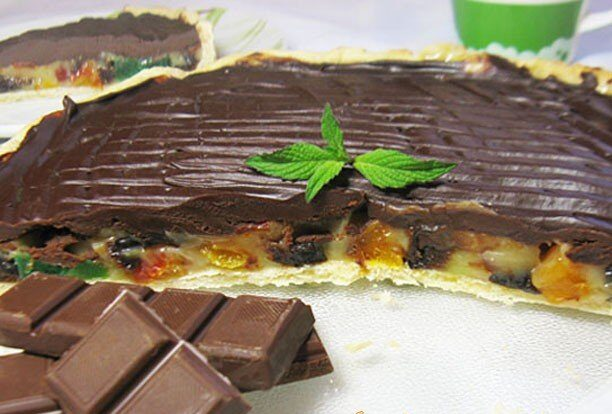 Сегодня предлагаю вам испечь замечательный красивый и вкусный пирог под толстым слоем шоколада :-). Сегодня уже 1-ое декабря, первый день зимы! Поздравляю Вас дорогие мои! Ждемс все снега и конечно приближающегося Нового года :-)! Он действительно необычайно вкусный! Начинка – сливочная ириска с разными сухофруктами. Вы можете поэкспериментировать и добавить цукаты или целые/молотые орешки. Я же, в скором времени, хочу очень попробовать приготовить такой пирог с орешками. Как сделаю, поделюсь рецептом ;-). Пошаговый рецепт Ингредиенты ДЛЯ ТЕСТА: ДЛЯ НАЧИНКИ: ДЛЯ ГАНАША: Ингредиенты для теста и начинки. Приготовить основу для пирога из рубленного слоеного теста. Как это сделать… Порубить холодное масло и муку. Добавить немного соли для эластичности теста. Рубленую крошку собрать горкой, в центре сделать колодец, вбить 1 яйцо (или добавить ледяную воду). Замесить тесто. Посмотрите тут подробное приготовление рубленого слоеного теста с пошаговыми фотографиями. Тесто распределить по форме,