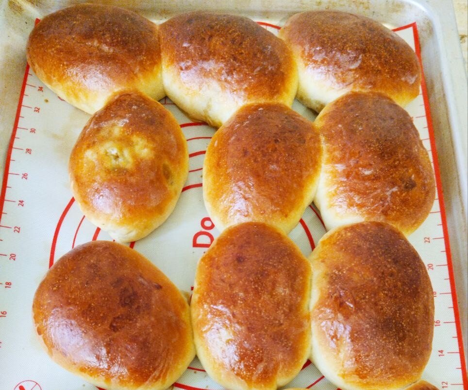После того, как все пирожки налеплены и уложены на противень, нужно накрыть их пленкой и дать настояться 20-30 минут. Далее поднявшиеся пирожки смазываем желтком, размешанным с 3 ч.л. молока и отправляем выпекаться при температуре 200 градусов на 20 минут. Для большого пирога потребуется около 35 минут времени. Спустя 10 минут после начала выпекания можно снизить температуру до 180 градусов, если верх выпечки сильно подрумянивается.