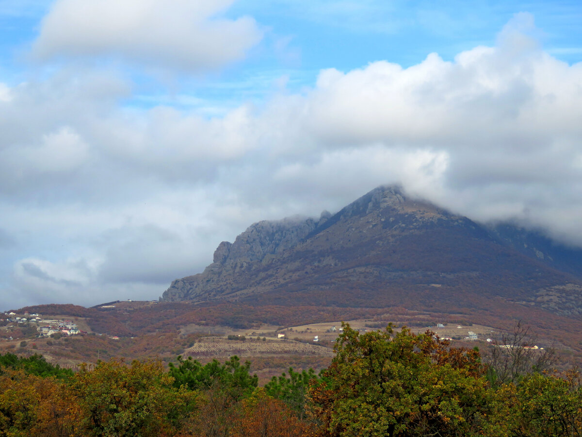 Начало - часть 1. На подъезде к Алуште впереди высится гора Демереджи, легкоузнаваемая своими очертаниями в хорошую погоду. Но сегодня облака прикрыли верхушку. Внизу видны домики села Лучистое. Но вот, буквально на одну минутку вершинка почти освобождается от белой шапки и этого вполне хватает, что бы сделать фотографию! Какие скалы! Теперь дорога будет еще более извилиста. Останавливаемся в следующем кармашке попить чайку и оглядеться. Над сосновым лесом на горизонте видны красивые облака. Я их приближаю для фотографии. И что я вижу! Я вижу, что под облаками горы! Он так далеко, что смотрятся голубыми облаками))) И наконец-то сквозь далекую дымку, просматриваются уже знакомые очертания мысов! А вот и Новый Свет! Вернее гора Караул-Оба! Но нам еще надо ни один раз спуститься и подняться на вершины этих гор по серпантину дорог. Нам очень нравится ездить по этой дороге! Каждый поворот открывает новый вид! Ну вот, Демерджи опять спряталась! Вслед за ней начинают показываться южные обрыв