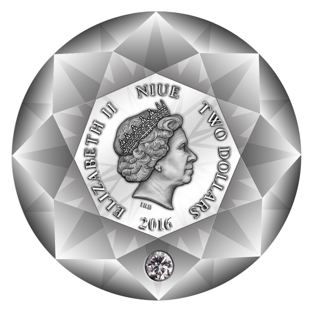 В 2016 году Монетный двор Швейцарии удивил мир, выпустив впервые в истории монету крайне необычной формы и дизайна – серебряную монету в виде бриллианта. Монета эта была выпущена по заказу правительства острова Ниуэ в Тихом океане – владения новой Зеландии. Номинал монеты – два доллара, но её реальная стоимость в сотни раз превышает его. Почему так? Что повлияло на стоимость? Сорок четыре грамма чистого (99,99%) серебра? Нет, этого мало. А дело в том, что при рассмотрении необычной монеты видна вставка – небольшой (0,1 карата) бриллиант. Это не ново, многие страны в наше время весьма часто используют драгоценные камни для украшения монет – но, согласимся, швейцарские мастера здесь поступили оригинально: монета в форме бриллианта украшена самым настоящим бриллиантом. Изготовить такую монету было делом весьма непростым - ведь надо было изготовить монету крайне сложной формы (32 грани в верхней части и 24 в нижней) и сделать это безупречно. Потом, надо было вставить в неё сложно огранённ