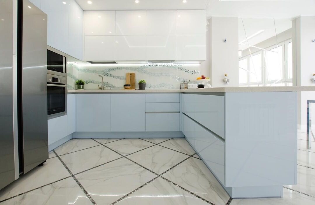 Стильный и лаконичный дизайн кухни, в которой отсутствуют лишние детали и преобладают четкие линии, а фасады гарнитура открываются простым нажатием. За счет гладких глянцевых фасадов кухонное пространство стало еще светлее и визуально больше. Кухонный гарнитур: