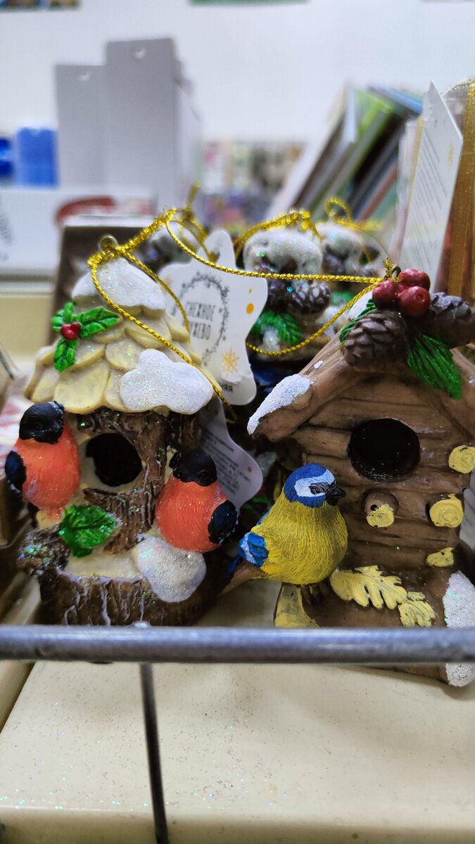 Приглядитесь к этим замечательным новогодним фигуркам. Такими привлекательными птичками порадовал нас китайский производитель "Снежное кружево". Эти птички-подвески, как мне кажется, очень симпатично будут выглядеть на ёлочке среди огонечков и мишуры. Этот сувенирчик стоит 99 рублей, я не смогла пройти мимо, руки зачесались поделится с вами такой находкой. Состав : полиэстер , полирезин.