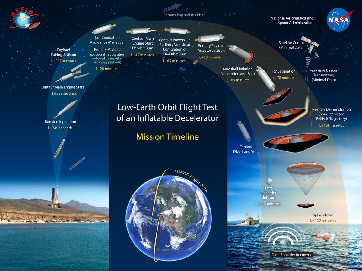 NASA провело успешные испытания надувной тормозной аэрооболочки в рамках проекта LOFTID, в ходе которого аэрооболочка развернулась на низкой околоземной орбите и вошла в атмосферу, после чего приводнилась в Тихом океане. Ожидается, что подобная система будет использоваться в дальнейшем для спуска грузов с околоземной орбиты и полётов к Марсу. Об этом пишет N+1 со ссылкой на данные агентства. LOFTID (Low-Earth Orbit Flight Test of an Inflatable Decelerator) стал новым этапом в деле разработки NASA гиперзвукового надувного аэродинамического замедлителя (HIAD), предназначенного как для спуска объектов с околоземной орбиты, так и для использования в будущих полётах к Марсу. Кроме того, подобное устройство может использоваться и для спускаемых аппаратов, отправляемых к Венере, Титану или газовым гигантам, и для возвращаемых на Землю капсул с пробами грунта с астероидов. HIAD состоит из набора надувных торов, создающих коническую конструкцию, и гибкой термозащиты. Кольца изготовлены из прочн