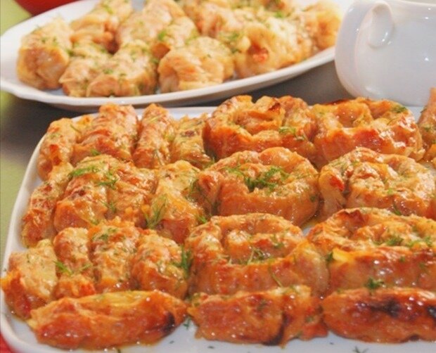 Приготовила голубцы по этому рецепту, так понравилось, теперь готовлю только этим способом. Для приготовления понадобится: Говяжий фарш - 600 гр Лук репчатый - 2 шт (150 гр) Отварной рис - 150 гр Петрушка - пучок Соль и специи по вкусу Всё перемешать, лучше руками. Капуста. Взять кочан капусты, удалить кочерыжку. В кипящую воду добавить уксус (9%) - 2 столовые ложки, поместить кочан капусты, периодически переворачивая. Листы капусты должны отходить целиковыми листьями, помогаем вилкой снять их с кочана. Те, которые хорошо отошли, перекладываем в отдельную посуду остывать. Берем лист, разрезаем пополам удаляя грубую часть. Так делаем со всеми остальными. Овощи. Разогреть сковороду, добавить растительное масло. Нарезаем лук - 250 гр, обжариваем. Добавляем морковь - 2 шт. (250 гр), обжариваем вместе с луком. Далее понадобится болгарский перец - 2шт (250 гр), нарезать соломкой, добавить к луку с морковью. Соль, чёрный молотый перец - по вкусу. Перемешать и положить томатную пасту - 1
