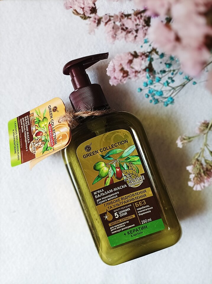 В составе уйма натуральных компонентов. ✅15 отборных экстрактов:Крапива, ромашка, календула, софора японская, люпина, любимчика, мыльянка, душица, шлемника байкальская, лопух, эдельвейс, вербена, женьшень, арника, эхинацея. (Некоторые даже и не знаю) ✅5 масел :Бабассу, жожоба, ииндаля, оливы, макадами. Производитель утверждает, что в составе нет SLS, парабенов, красителей, минеральных масел. ✅Аромат нежный, ненавязчивый. ✅Не утяжеляет волосы ✅Придает блеск и гладкость ❌Не экономичный расход и не удобный дозатор Для хорошего эффекта на волосах советую подержать 10-15 минут ❌Убитые волосы не восстановит После применения волосы мягче, легче расчесывются, меньше путаются. Мне понравился эффект после использования бальзам-маски Green Collection.