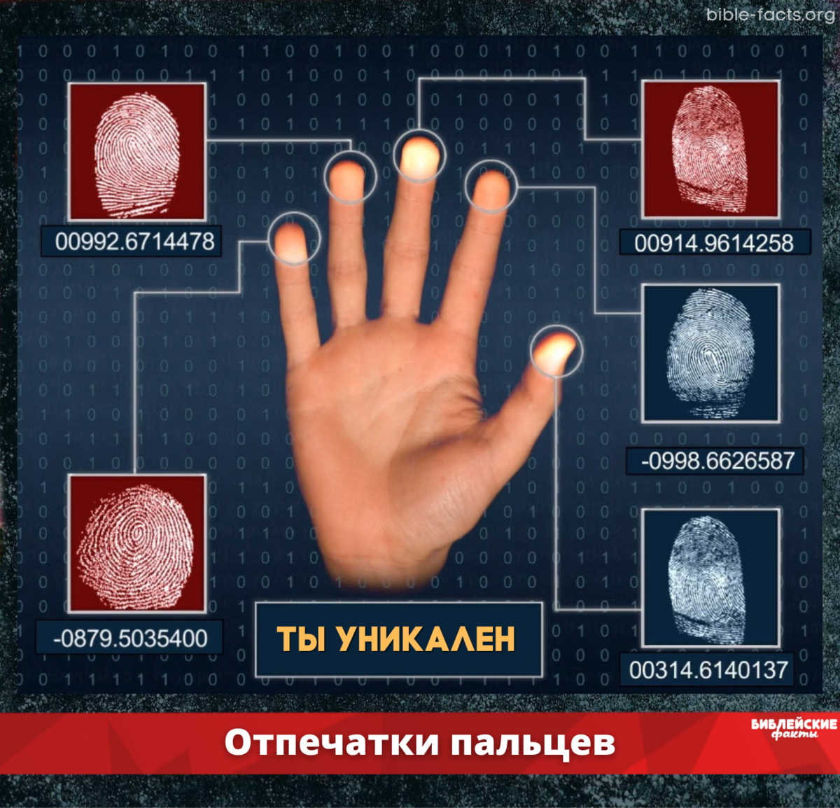 Отпечатки пальцев — печать Божья на руке каждого человека. Об этом написано в книге Иова: «Он полагает печать на руку каждого человека, чтобы все люди знали дело Его» (Иов 37:7). Некоторые факты об отпечатках пальцев: • Каким бы образом человек не пытался повредить или стереть свою кожу на пальцах рук, рисунок на них все равно восстановится. Избавится от своего индивидуального рисунка на пальцах невозможно. • Даже у однояйцевых близнецов, обладающих идентичной ДНК, отпечатки пальцев всегда отличаются. • Отпечатки пальцев остаются неизменными в течение всей жизни, тогда как другие линии на ладонях постоянно изменяются. • Отпечатки пальцев появляются у человека ещё в утробе матери, в возрасте 18 недель после зачатия. • Рисунок на подошвах и пальцах ног тоже индивидуальный у каждого человека. • До сего дня не встречалось ни одного случая, когда отпечатки двух пальцев были бы одинаковы. 🙏 Божья печать на руке каждого человека - это подтверждение Его авторства, т.е. каждый человек - дело р