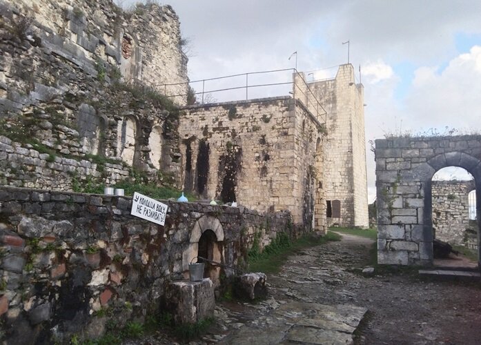 На Иверскую гору я поднялась довольно легко и достаточно быстро. Это с дороги крепость кажется неприступной, а, когда идёшь по серпантину, этой самой неприступности не ощущаешь. В какой-то момент вдруг как будто начинает не хватать кислорода. Но вы же взяли с собой бутылочку с питьевой водой? Остановитесь, попейте воды, оглядитесь. Такая красота вокруг, что моментально забываешь обо всех своих недомоганиях и печалях. Через некоторое время дыхание отпускает, и ты опять дышишь полной грудью. Впечатлений по сторонам столько, что усталости не чувствуется, да и адреналинит слегка в Абхазии постоянно. Всё-таки это чужая страна, чужой народ, ты всё равно это подсознательно должен чувствовать, даже если внешне не подаёшь виду. НЕИССЯКАЕМЫЙ КОЛОДЕЦ НА ИВЕРСКОЙ ГОРЕ Самое первое, на что я набрела внутри развалин крепости, это был тот самый неиссякаемый колодец. Ведро я не сфотографировала почему-то, да и не зачерпнула воды этим ведром. Покричала в глубину колодца. Эхо далеко-о-о-о полетело. Как