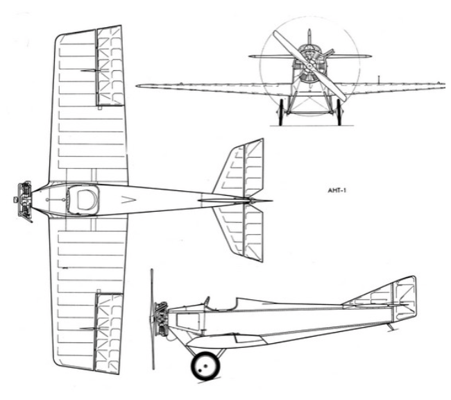 Тактико-технические характеристики самолета АНТ-1: - Главный конструктор: А. Н. Туполев - Первый полёт: 21 октября 1923 - Единиц произведено: 1 Экипаж АНТ-1: - 1 человек Габаритные размеры АНТ-1: - Длина: 5,4 м - Высота: 1,7 м - Размах крыльев: 7,2 м - Площадь крыльев: 10 м² Вес АНТ-1: - Взлётная масса: 360 кг - Масса пустого: 229 кг - Полной нагрузки: 131 кг Двигатель АНТ-1: - Тип двигателя: 1×Анзани - Мощность: 35 л. с. Скорость АНТ-1: - Максимальная скорость: 125 км/ч Продолжительность полёта АНТ-1: - 4 ч Дальность полёта АНТ-1: - 540 км Практический потолок АНТ-1: - 600 м А.Н. Туполев в конце 1922 г. уже считал, что будущее авиации (особенно Тяжелой) в цельнометаллических конструкциях. Свою точку зрения обосновывал недостатками деревянных конструкций и многочисленными достоинствами металлического самолетостроения. К тому времени в некоторых передовых странах уже были построены первые цельнометаллические самолеты. По предложению Госпромцветмета при ЦАГИ в октябре 1922 г. была орга