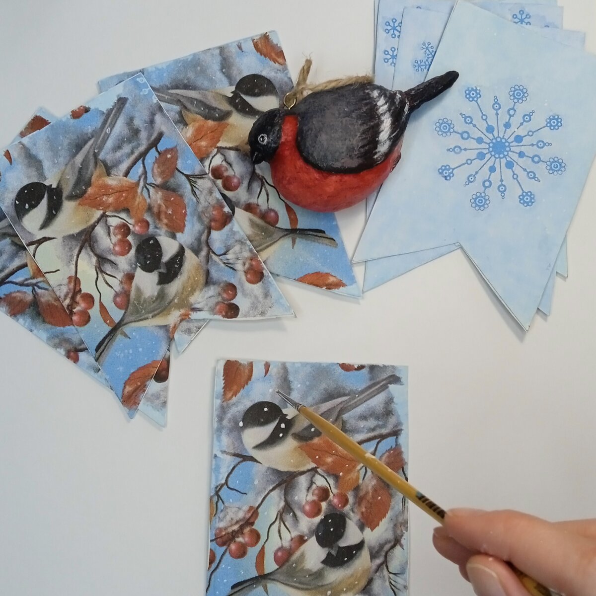 Сейчас в магазинах представлен огромный ассортимент продукции для декора на разнообразный вкус и кошелëк. Очень удобно, ведь есть уже готовое решение. Может быть кто-то помнит, раньше новогодние украшения для праздника многие делали сами. На уроках труда дети мастерили ёлочные игрушки и гирлянды, вырезали снежинки. У меня, например, вызывают ностальгию новогодние флажки, которыми украшали залы с новогодней ëлкой в школах, детских садах и домах культуры. Решила сделать что-то подобное. Работать буду в технике декупаж. Мне понадобится белый картон, клей ПВА, салфетки для декупажа, обёрточная бумага, ножницы, кисти, акриловые краски, карандаш, линейка, джутовый шпагат, игла с большим ушком. Шаг 1. На картоне карандашом делаю разметку флажков в виде прямоугольников 9x14 см Шаг 2. Вырезаю флажки при помощи ножниц. Шаг 3. От салфетки отделяю лишний слой. Можно полностью приклеить картинку на флажок или использовать небольшие мотивы, тогда потребуется подрисовка. Чтобы картинка легла на п