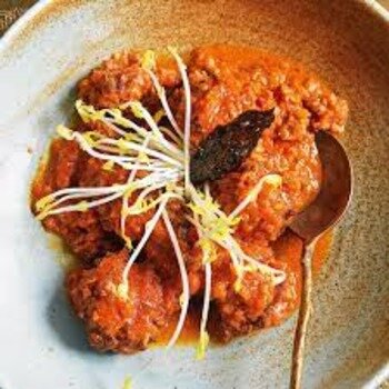 «Они очень похожи на итальянские фрикадельки, поэтому мне хочется верить, что существует своего рода преемственность между итальянской и индийской едой, предпочитаемой арабскими владыками» Ингредиенты 4 человека 500г говяжьего фарша 160г йогурт 120г томатного пюре 100г лук 4 стручка кардамона 4 гвоздики 3 зубчика чеснока 1 палочки корицы порошок красного перца чили куркума свежий имбирь асафетида нутовая мука приготовление горчичного масла (как вариант, оливковое масло первого холодного отжима) оливковое масло первого отжима соль Метод