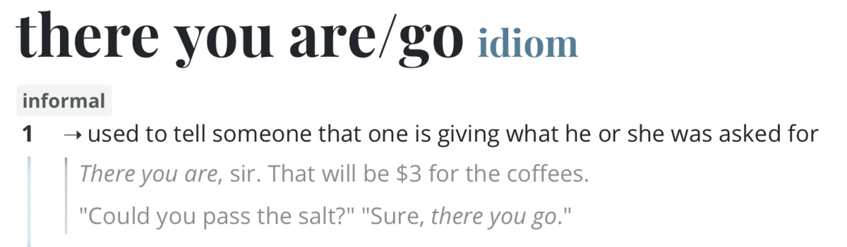 There you go - это одна из тех универсальных фраз, значение которых зависит от контекста, тона голоса, отношения со собеседником и, возможно, от сотни других факторов. В этой статье попытаюсь охватить самые употребляемые значения. Часто на русский переводится со словом "вот". 1. Вот, пожалуйста Эту фразу используют, когда передают другому человеку то, что он попросил: "Вот, пожалуйста", "Держи", и т.п. В этом случае также можно использовать here you go. Вы попросили друга передать вам телефон и он это делает со словами There you go. Или here you go. Причем второй вариант даже будет предпочтительнее. 2. Вот, готово! Так-то лучше, не благодари Так говорят, когда кто-то попросил вас что-то сделать для них и выполнив просьбу, вы произносите - there you go! Или когда вы самостоятельно решили кому-то помочь и, получив удовлетворительный результат, произносите эту фразу. Например, у вас заглючил телефон, вы попросили своего tech savvy (хорошо разбирающегося в компьютерах и современных технол