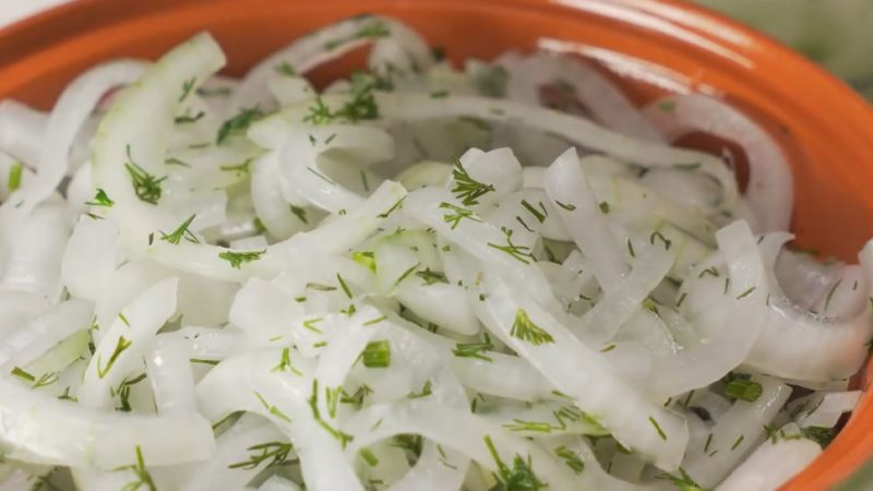 Многие не любят сырой лук из-за запаха горечи, но маринованный — совсем другое дело! Такой лук можно добавлять в различные салаты и мясные блюда. Следуйте нашей инструкции и у Вас всё получится! Необходимые ингредиенты Мариновать лук — рецепт: Шаг 1. Делаем маринад Для начала сделаем маринад для лука. Для этого, в удобную глубокую миску — наливаем 250 миллилитров воды, затем добавляем 4 ложки уксуса 9%, затем 1 ложку сахарного песка и столько же соли. Перемешаем жидкость, что-бы сахар с солью растворились, затем срезаем у укропа грубые стебли и убираем их. Сам укроп мелко нарезаем и добавляем в маринад. Маринад готов. Шаг 2. Нарезаем лук Лук можно нарезать так, как вы хотите. Можно кубиками, можно кольцами, можно пустить через специальную тёрку. Но лучше всего получается, когда лук нарезан полукольцами и слои отделены, таким образом у нас получается целая горка индивидуальных луковых полукруглых кусочков. Для этого просто разрезаем луковицу на 2 части, потом нарезаем каждую часть сбоку