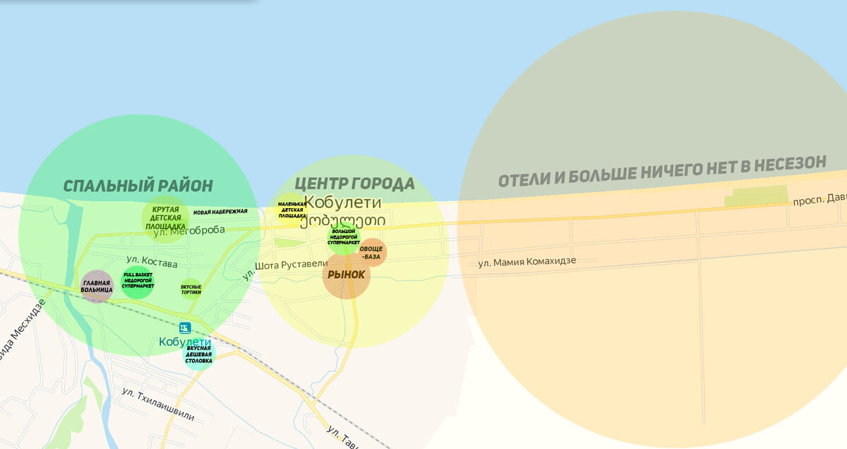 Главный минус при поиске жилья на месяц или более долгий срок в новом для себя городе - вы не знаете какой район лучше. Далеко ли магазины, где вы будете покупать продукты? Если вы с детьми, то где хорошие детские площадки, частные детские садики и где найти кружки по интересам? Таких вопросов перед переездом очень много. Я сделал карту районов Кобулети, чтобы у вас было примерное представление о том, где лучше искать жильё. Подсказка: между центром города и спальным районом.
