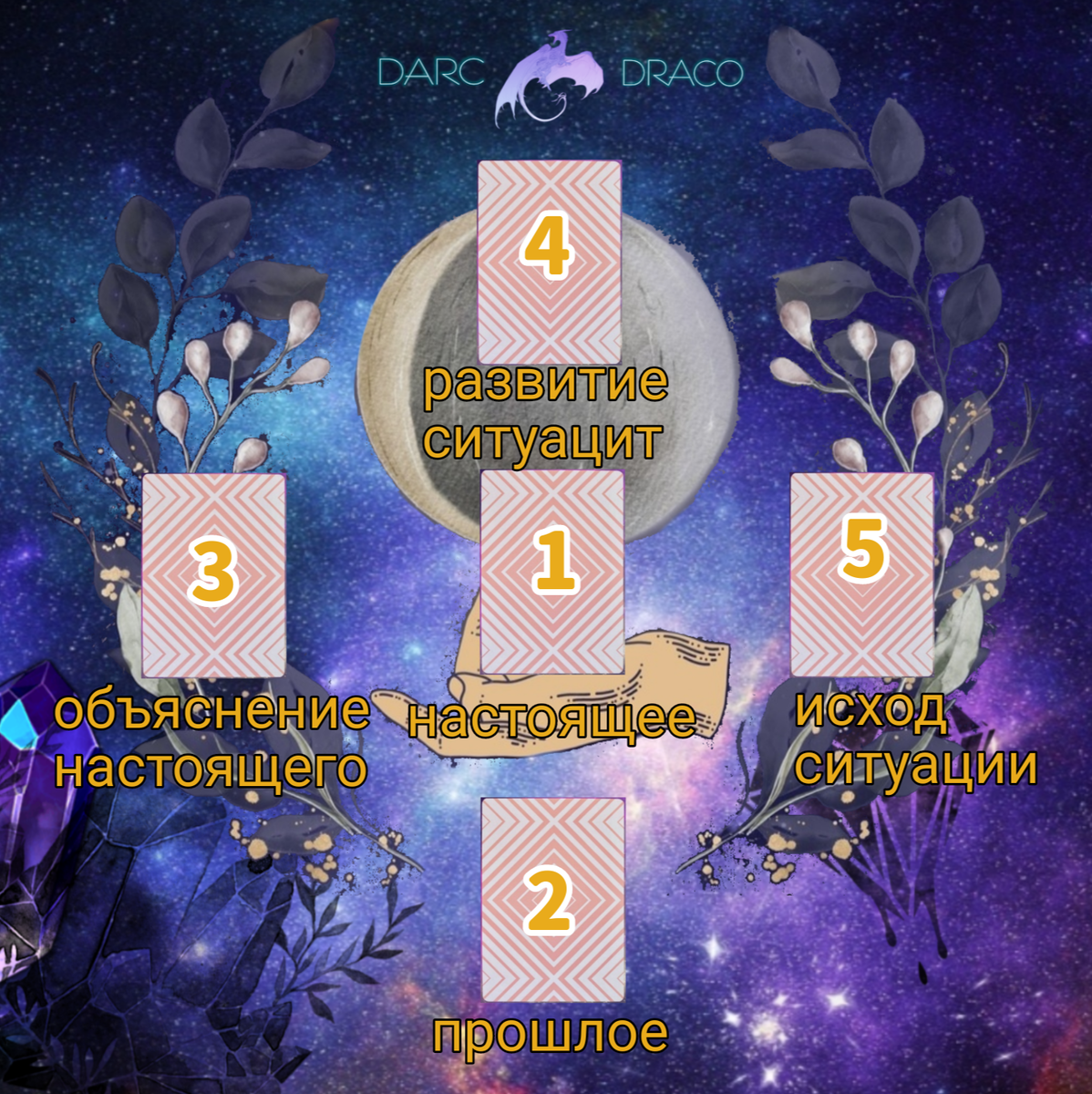 Расклад карт таро на различные вопросы: бизнес, отношения, дружба, дела и так далее. 1. Первая карта кладется по середине, она обозначает, что происходит у человека сейчас, описывая ситуацию в целом. Это может быть любая карта - как Младший, так и Старший Аркан. 2. Вторая карта кладется вниз - она обозначает прошлое, показывает, почему ситуация возникла. 3. Третья карта кладется слева и даёт объяснение настоящего. 4. Четвертая карта кладется наверх и показывает, как будет развиваться ситуация, даëт совет. 5. Пятая карта - справа - показывает, куда ситуация придет. Значение каждой карты рассматривается относительно той карты, которая находится посередине, рассматривается сочетание двух карт.