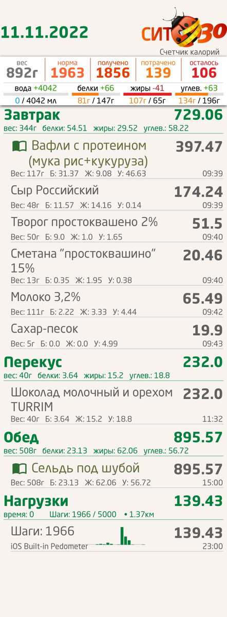 Привет! Сегодня я готовила салат «сельдь под шубой» и кроме него мне ни чего не хотелось. Белок добирала своими протеиновыми вафлями, ела их вместо хлебушка. Не стала вбивать одно и тоже блюдо много раз, добавляла вес только. А вот так это выглядело Завтра у мужа день рождения, праздновать он не хочет, но праздник живота не считается. Даже самой интересно, смогу ли считать калории и не превысить их. В планах срыва нет. Зато тортик испечь вполне себе планирую 😁 Ну лучше уж домашний, чем покупной химозный. Как вы спасаетесь по праздникам? Стойко держитесь или спокойно проживаете этот день без подсчета?