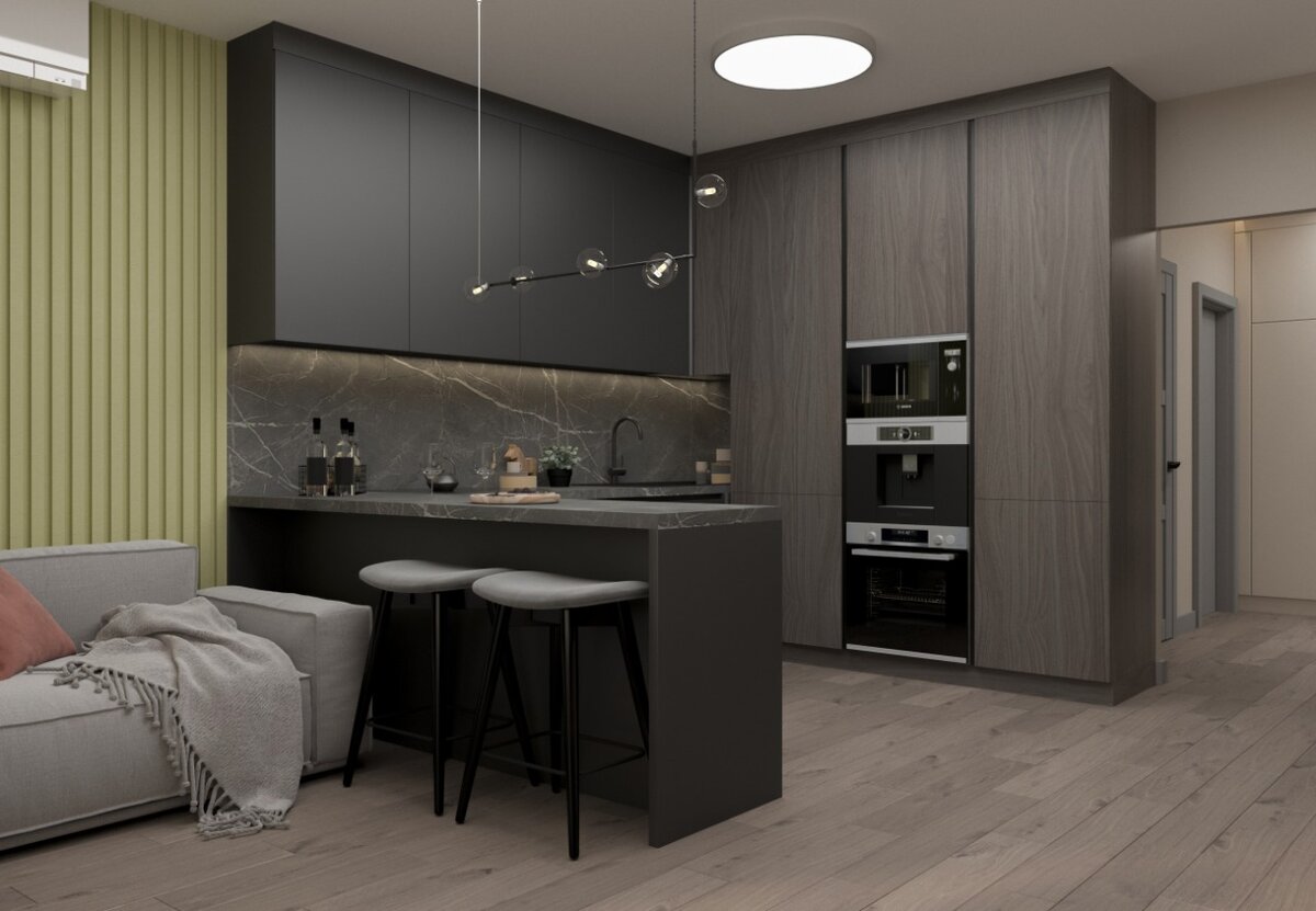 Расскажу про дизайн проект квартиры, который мы реализовали под ключ в Московском ЖК Forest для семьи с двумя дочками. Исходные данные: квартира 90 м2 с предчистовой отделкой. Как заявлял застройщик:”Клей обои и заезжай”. p.s. все оказалось не так. В конце статьи добавлю несколько фотографий с практически готовым ремонтом. Этот проект мы реализовали полностью под ключ от проекта до ремонта и закупки всех чистовых материалов, мебели. Основные задачи, которые стояли перед дизайнером: ✔️Современный интерьер в нейтральных оттенках, но с акцентами. ✔️Использовать фактуру под дерево, бетон, мрамор, рейки в цвете. ✔️Цвета: серый,графитовый и бежевый взять за основу. ✔️Уложиться в оговоренный бюджет. ✔️Сделать уютную квартиру для счастливой жизни. Мое любимое место в этом проекте-это кухня. Здесь было важно сделать зону отдыха, барную стойку, стол обеденный, много мест хранения и акцентную ТВ зону. Мы остановились на идее панели под мрамор,которая разрезана в хаотичном порядке. Она служит е