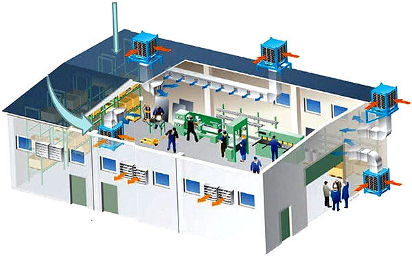 Охладитель воздуха испарительного типа - это охлаждение, увлажнение, очистка воздуха и мощная система приточной вентиляции - все в одном устройстве для промышленных и коммерческих помещений. Принцип работы При процессе испарения воды, поглощается тепло из окружающей среды, вследствие чего, воздух становится холоднее. Этот природный процесс происходит без привлечения энергии извне, охладители воздуха испарительного типа используют этот физический процесс для создания эффекта морского бриза. Испарительного охлаждение представляет из себя адиабатический процесс при постоянной энтальпии, для охлаждения воздуха требуется только вода и небольшое количество электроэнергии для работы вентилятора и водяного насоса. Вода на фильтры подается от насоса, установленного в поддоне. Энергия, необходимая для испарения, берется из самого воздуха, поэтому воздух охлаждается. Вода испаряется в виде молекул. Пыль и бактерии, содержащиеся в воздухе и минеральные соли из воды, остаются на поверхности фильтра