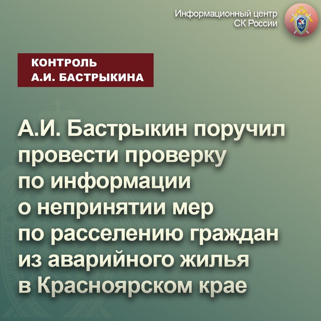 А.И. Бастрыкин поручил провести проверку по информации о непринятии мер по расселению граждан из аварийного жилья в Красноярском крае В СМИ сообщалось, что в Бирилюсском районе Красноярского края 18 семей с 2016 года проживают в аварийном доме. Местная администрация предложила выселиться им из непригодного жилья добровольно без предоставления новых квартир. Указывается, что суд встал на сторону жильцов, однако до настоящего времени их нарушенные права, в том числе женщины-инвалида, не восстановлены. Она вместе с сыном вынуждена жить в квартире, где отключено отопление и водоснабжение. Председатель Следственного комитета Российской Федерации Александр Иванович Бастрыкин поручил руководителю ГСУ СК России по Красноярскому краю и Республике Хакасия Алексею Леонидовичу Еремину провести процессуальную проверку по озвученной в публичном пространстве ситуации и доложить о ее результатах, а также принимаемых мерах, направленных на восстановление жилищных прав жильцов аварийного дома. Ход и
