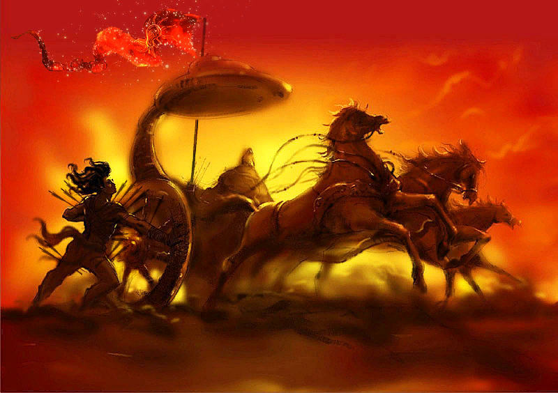 Сжигаемый жаром оружия, мир шатался, как в лихорадке. Слоны загорались от жара и дико носились туда и сюда в поисках защиты от ужасной силы. Вода стала горячей, звери погибали, враг был скошен, а неистовство огня валило деревья рядами… Тысячи колесниц были уничтожены, потом глубокая тишина опустилась на море. Начали дуть ветры, и Земля осветилась. Трупы погибших были изувечены ужасным зноем так, что они больше не походили на людей».
