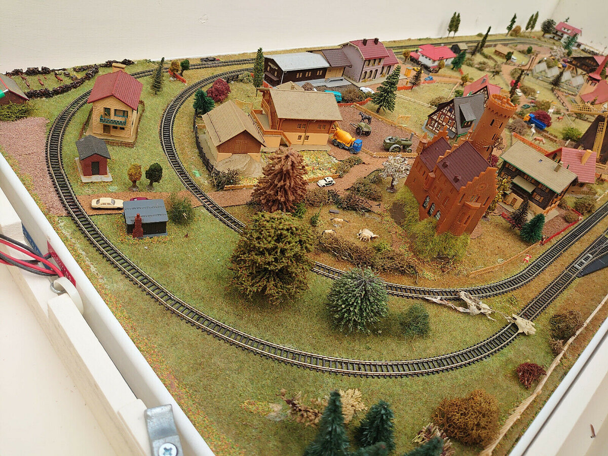 Макет состоящий из двух независимых овалов. Есть одна стрелка в тупиковый путь. В данном жд макете приоритетный уклон сделан не на железную дорогу а на оформление ландшафта. Небольшой провинциальный городок. Полустанок с небольшой автомобильной привокзальной парковкой. Три "Аналоговых" блока управления. Два отвечают за питание локомотивов, каждый на своём овале, по отдельности. Третий подключен к запасному тупиковому пути, что бы там тоже было можно независимо управлять отдельным поездом. С современной цифровой системой управления DCC, уже не нужно городить такой "огород" из трансформаторов. Там ко всем рельсам подключается всего два проводка. И рули сколько хочешь поездов с одного пульта. Так выглядит жд макет целиком. Вид сверху. Небольшая подборка подвижного состава, в масштабе Z (1:220), который успешно эксплуатируется на данном жд макете. В целом жд макет приятный на вид. Сделан с душой. Больше подойдет просто любителям жд моделей, без активной эксплуатации моделей подвижного сос