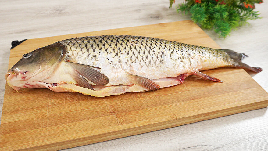 В этой статье хочу рассказать о рецепте очень вкусного карпа, который будем запекать в духовке целиком. Крупная, мясистая рыба выглядит очень эффектно и подойдёт к любому столу. Пользуется карп популярностью не только в нашей стране, но и во многих других странах. Карп может превзойти даже лосося, если уметь с ним работать и подобрать правильные компоненты для подачи. Особенно хорошо он выходит при тушении в духовке или запекании с овощами. Блюдо, запеченное в духовке, получится сочным и, что станет приятно тем, кто следит за рационом, диетическим. Все ингредиенты для приготовления данного рецепта представлены в конце статьи. Способ приготовления: Подготавливаем рыбу, очищаем ее от чешуи, убираем плавники, разрезаем брюшко, убираем внутренности. Делаем надрезы поперек рыбы, как показано на фото. Посыпаем рыбу солью, черным перцем и приправой для рыбы. Втираем специи руками в рыбку. Во внутрь брюшка тоже втираем соль, черный перец и приправу для рыбы. Выкладываем рыбу на противень. Н