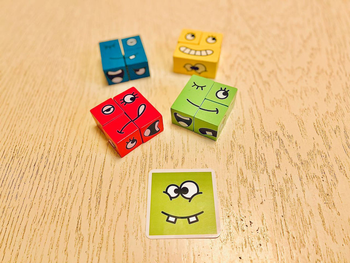 Игра - на скорость из кубиков надо собрать эмоцию, показанную на карточке в течение 3-5 секунд. Побеждает то, кто первый по памяти правильно соберёт эмоцию.