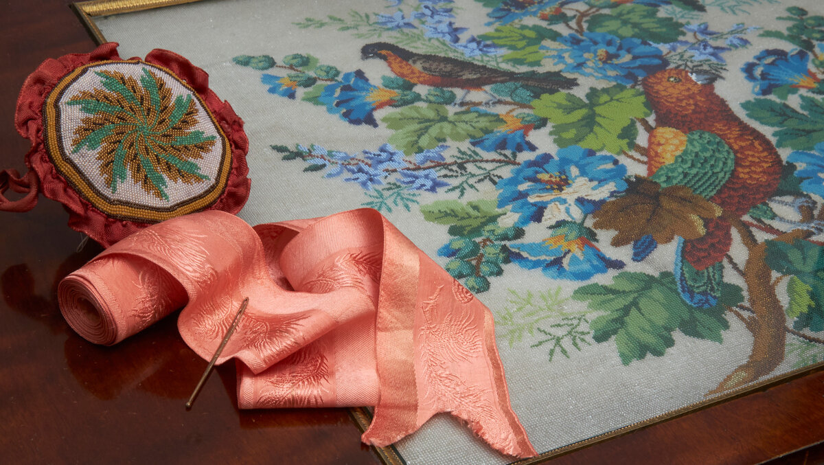Примеры русского бисерного искусства из собрания ГМЗ «Останкино и Кусково» дополнены мебелью и предметами обстановки из Музея-усадьбы «Остафьево-«Русский Парнас». Среди самых интересных — зеркало-псише первой трети XIX века в раме из красного дерева. Это специальное зеркало, которое закреплено между стойками на шарнирах и может менять угол наклона, чтобы человек видел себя в разных ракурсах.
