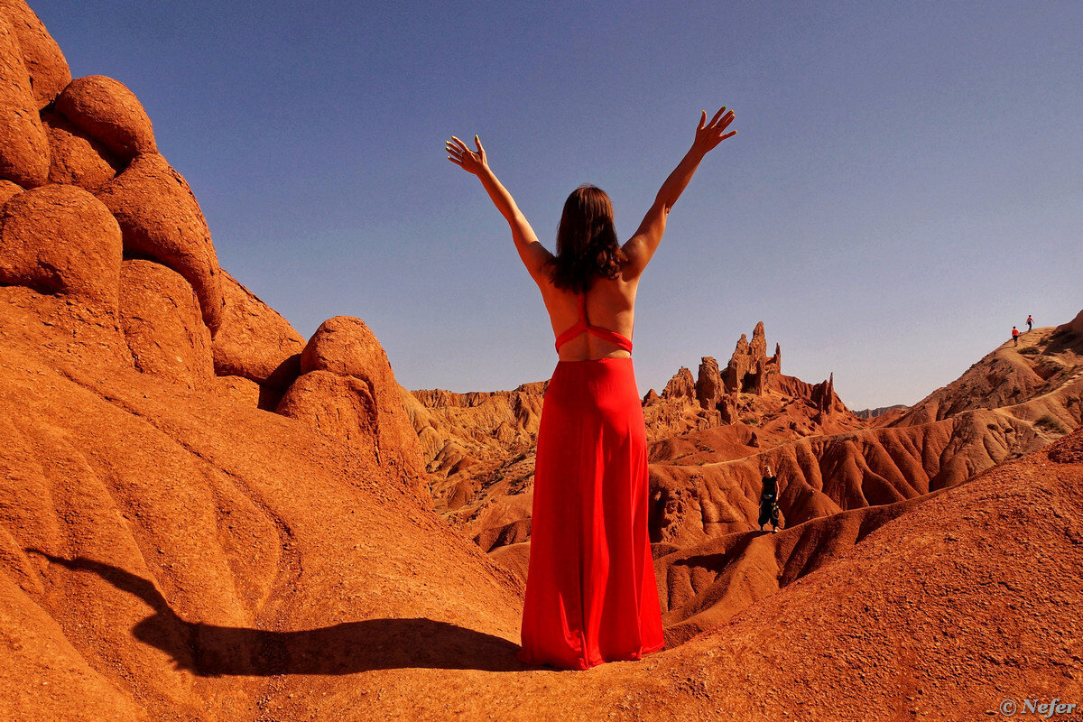 На южном берегу озера Иссык-Куль находятся два совершенно фантастических места. Они расположены недалеко друг от друга, можно посетить за один день. Это просто WOW. Ущелье Сказка находится вблизи села Тосор. Нужно свернуть с трассы в сторону гор и проехать примерно 3-4 км в глубину. На дороге установлен указатель, прям так и написано "каньон СКАЗКА / FAIRY TALE canyon". Есть небольшая площадка для парковки, дальше пешком. Идти недолго, это не поход. В какой-то момент и без того скудная растительность заканчивается и начинаются сказочные пейзажи. Каньон Сказка поражает воображение! Причудливые формации из красного песчаника эффектно выглядят на фотографиях. Есть, где полазить. Но надо быть осторожным, отдельно стоящие столбики и отвесные полочки могут быть непрочными, карабкаться на них не стоит, ведь это не камень, а крошащаяся глина. Каньон сравнивают с американскими национальными парками, Аризона, Юта, вот это вот все. Ну да, пожалуй, похоже на Брайс-каньон. Только он раскручен и изв