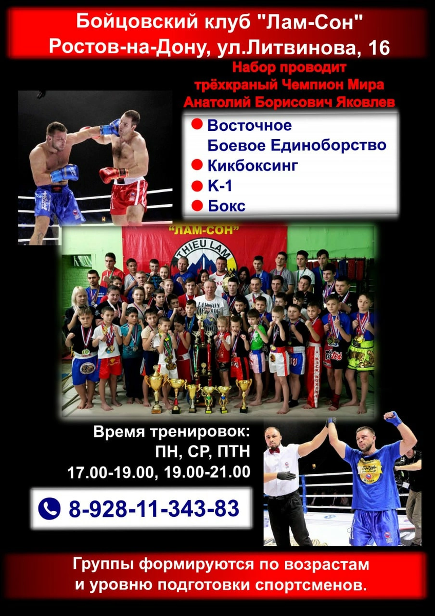 •Восточное Боевое Единоборство •Кикбоксинг •К-1 •Бокс Набор проводит трёхкратный Чемпион Мира Анатолий Борисович Яковлев Группы формируются по возрастам и уровню подготовки спортсменов. Обращаться по телефону 8 (928) 113-43-83 Адрес Ростов-на-Дону ул.Литвинова 16