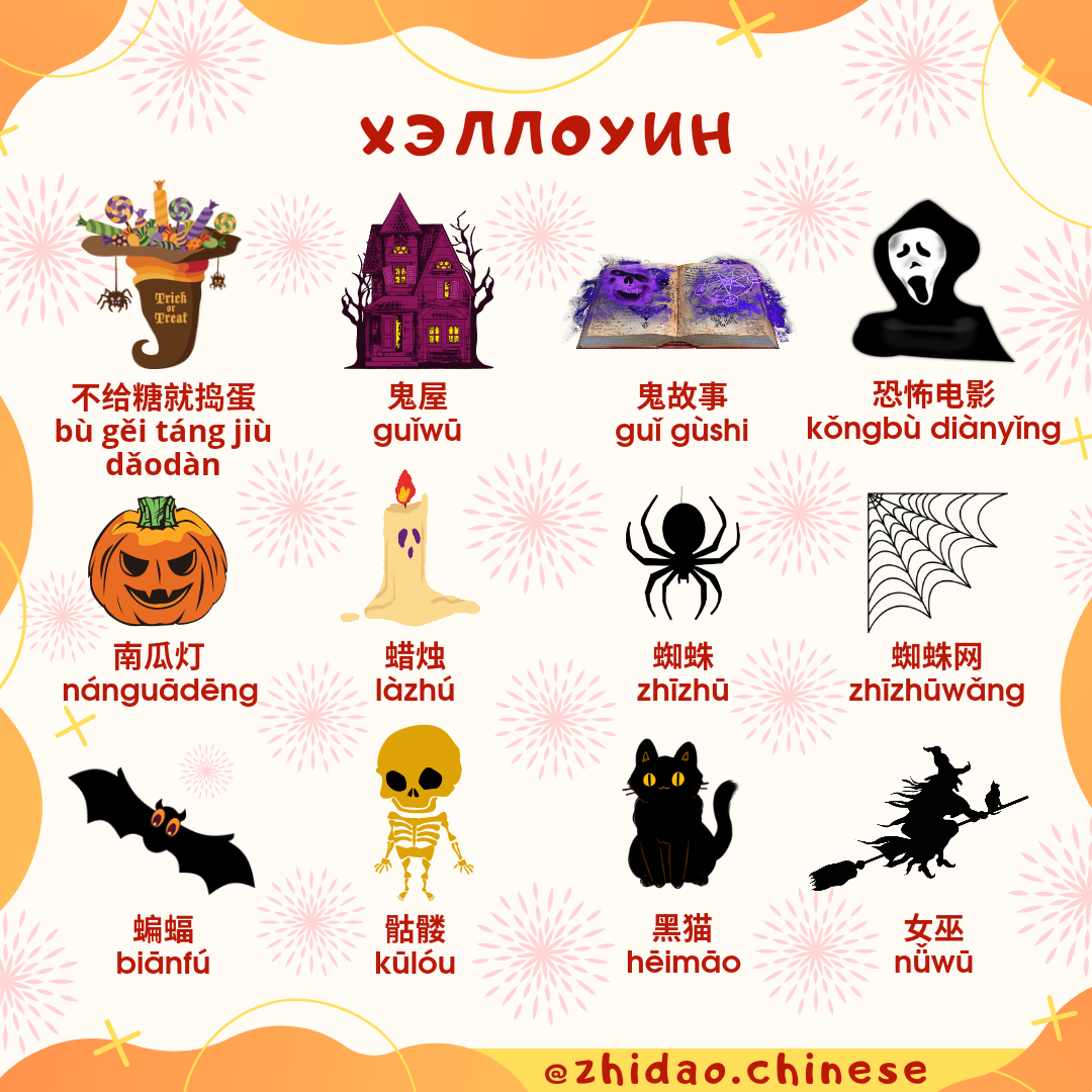 #zhidao_шпаргалки 📝 Наступил Хэллоуин! В Китае любят соблюдать его традиции (хотя этот праздник не является там культовым), например, украшениями, нарядами 👻 Поэтому сегодня мы подготовили для вас шпаргалку на тему "Хэллоуин" (万圣节 wànshèngjié)! 🎃 🔸不给糖就捣蛋 bù gěi táng jiù dǎodàn сладость или гадость? 🔸鬼屋 guǐwū дом с привидениями 🔸鬼故事 guǐ gùshi "страшилки", страшные истории 🔸恐怖电影 kǒngbù diànyǐng фильм ужасов 🔸南瓜灯 nánguādēng светильник Джека (вырезанная в виде головы тыква с подсветкой) 🔸蜡烛 làzhú (восковая) свеча 🔸蜘蛛 zhīzhū паук 🔸蜘蛛网 zhīzhūwǎng паутина 🔸蝙蝠 biānfú летучая мышь 🔸骷髅 kūlóu скелет 🔸黑猫 hēimāo чёрный кот, чёрная кошка 🔸女巫 nǚwū ведьма 📝 Ссылка на карточки Quizlet для изучения новых слов: https://quizlet.com/_c9au0o?x=1jqt&i=2r5snr ❗В Quizlet вы можете послушать произношение всех слов! Для этого в различных режимах изучения или при просмотре списка слов нажмите на значок микрофона 🔊 📚 Хотите, чтобы Вы или Ваш ребенок заговорили на китайском? Напишите нам для