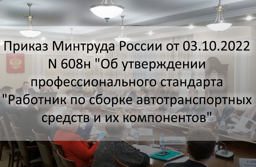 Приказ Минтруда России от 03.10.2022 N 608н "Об утверждении профессионального стандарта "Работник по сборке автотранспортных средств и их компонентов" Зарегистрировано в Минюсте России 24.10.2022 N 70673. С 1 марта 2023 г. применяется актуализированный профессиональный стандарт "Работник по сборке автотранспортных средств и их компонентов"