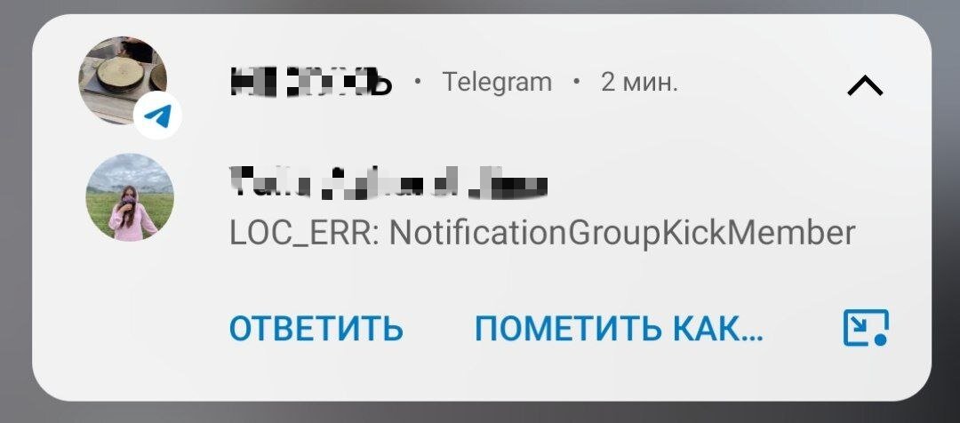 Встретил недавно интересное оповещение от telegram, сначала не понял что произошло. Проблема оказалась на android, при удалении собеседника из группового чата приходит интересное оповещение " loc_err: notificationGroupKickMember" #bug #тестирование #telegram @TELEGRAM