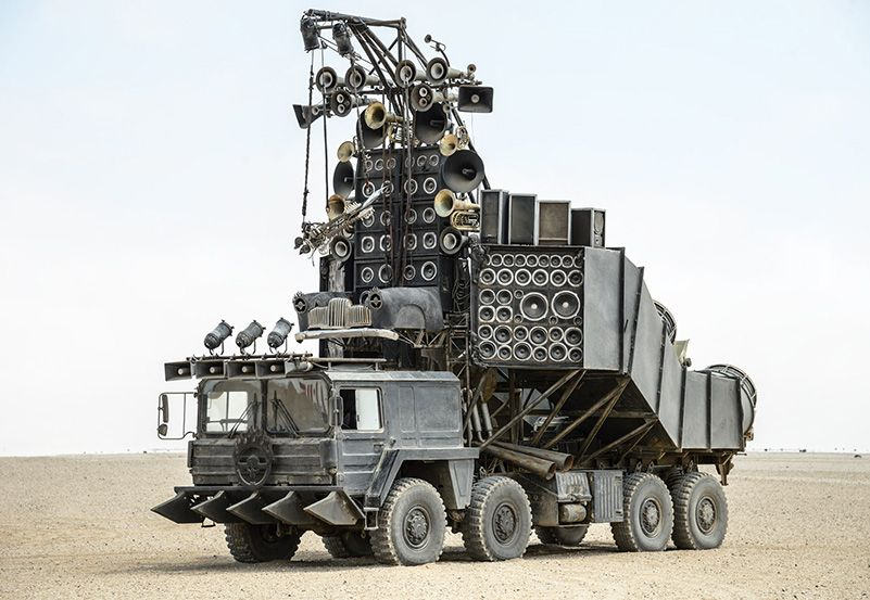 Продолжаю повествование про автомобили "Дороги Ярости" MAN KAT I A1 (8x8) "Doof Wagon" Идея сделать "музыкальный грузовик", использующийся для психологической войны, принадлежит Джорджу Миллеру. Художник-постановщик фильма Коллин Гибсо пытался бороться с этой идеей, но, наконец, сдался. И не зря! В итоге на экране появился харизматичный, узнаваемый грузовик Кстати, если сам фильм вышел на экраны в 2015 году, то первые концепты Doof Wagon относятся еще к 2001 году: Судя по надписям на иллюстрации, изначально Doof Wagon планировали сделать из МАЗ-543 «Ураган». В концептах 2010 года музыкальный грузовик приобретает уже более-менее узнаваемый вид: То есть понятно, что только подготовка к съемкам "Дороги ярости" заняла полтора десятка лет! В итоге Doof Wagon был сделан из грузовика MAN KAT I A1 (8x8), а сцена гитариста выполнена из передней части автомобиля Holden FJ. Воздуховоды сделаны из промышленных вентиляционных коробов. Далеко не все динамики были подключены, даже гитара изначально б