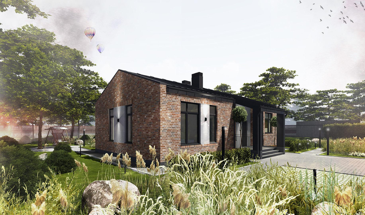 Одноэтажный дом для семьи до 5 человек под двускатной кровлей с таррасой и крыльцом, 145 кв. м