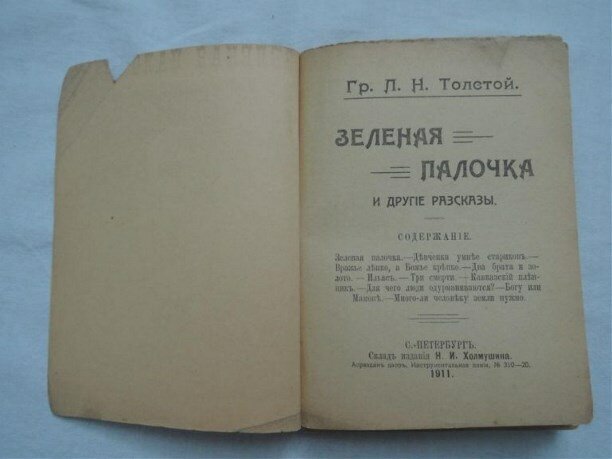 Вскоре после смерти Льва Толстого один из его последователей, сын крестьянина Иван Наживин, благодаря Толстому ставший крупным писателем, открыл издательство под названием «Зелёная палочка».